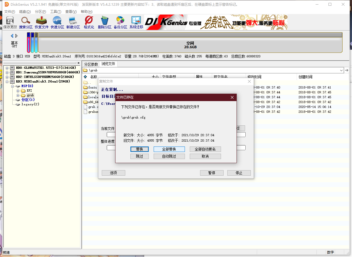 重新打开DiskGenius,在U盘内找到grub文件夹,点击右侧的grub.cfb文件,右键复制到桌面。