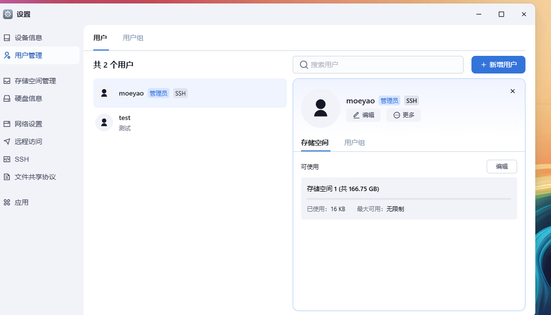 可以设置用户,但是仅能选择用户组、选择可以使用的存储空间。