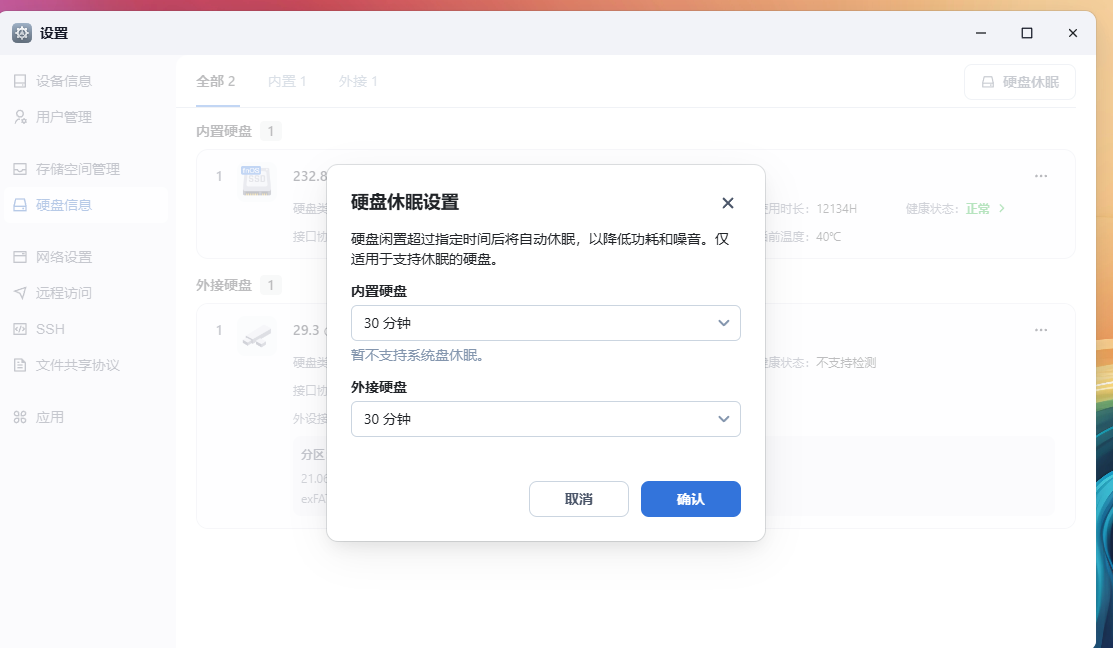 可以设置硬盘休眠