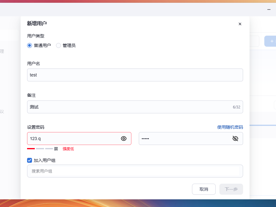 弱口令无法选择下一步,不能创建弱口令。
