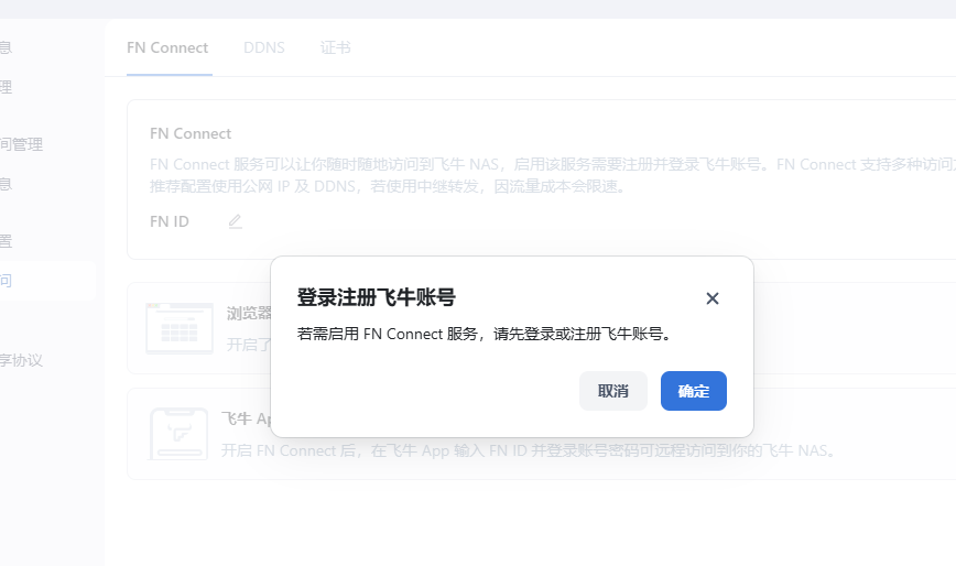 飞牛账号那里,会显示你注册的账号,账号只能用手机号注册。FN Connect 会显示官方提供的远程访问链接。