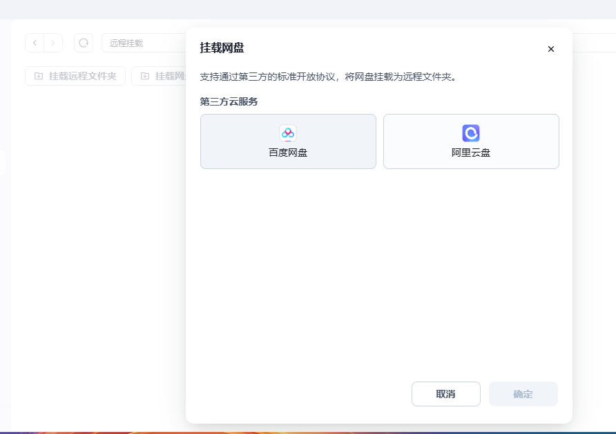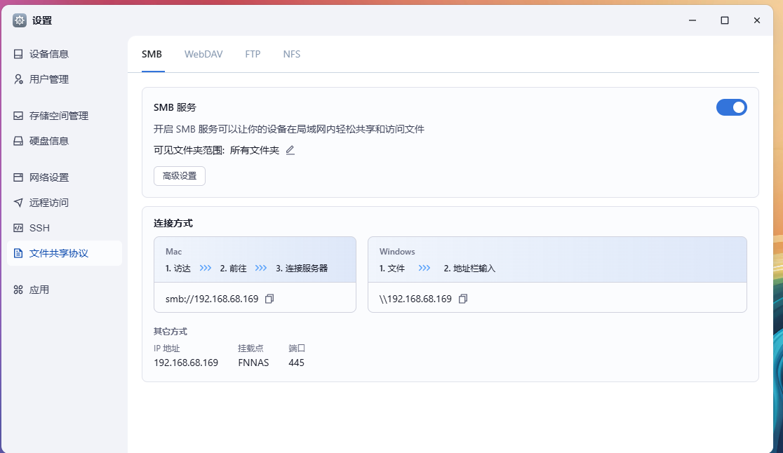 支持SMB、WebDAV、FTP、NFS四种。