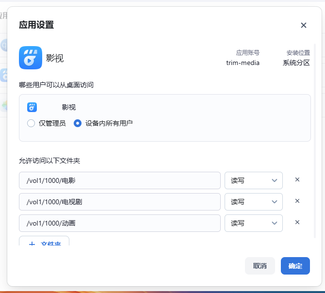 可以针对安装的应用设置权限,可以设置允许访问的目录和允许访问的用户。