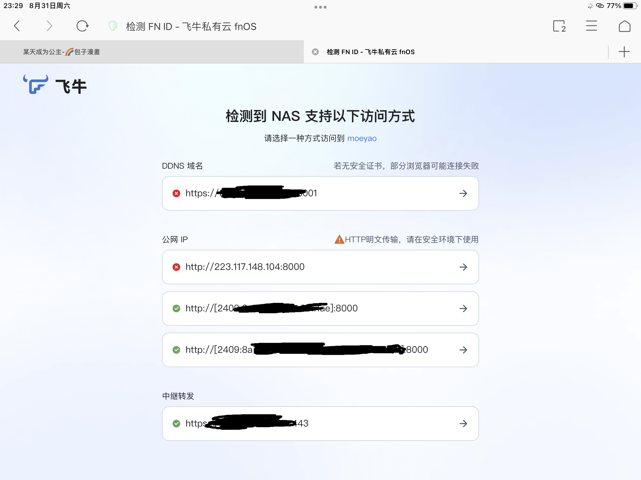 使用官方的远程访问服务,挺简单。访问给你的FN ID,会打开一个网页,会显示你设置的DDNS域名,可以选择通过ip直连或者服务器中转的方式进行远程访问,并且可以看到哪个方式能够联通,这一点我觉得很不错。