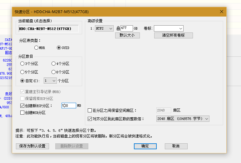 然后新建分区,一个分区就够了,然后添加一个ESP分区,ESP分区需要有最小300MB空间,我这里分配了500MB。