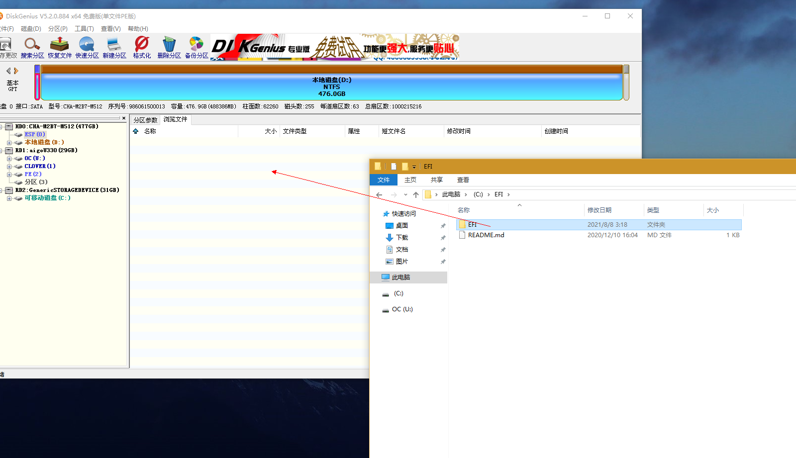 将我们准备好的EFI引导文件放到硬盘的ESP分区里面。然后关闭电脑。拔掉优盘,重启即可。非常简单。千万不要放错地方了。一定要安装截图中剪头指示的地方存放。文件直接拖过去就可以了。